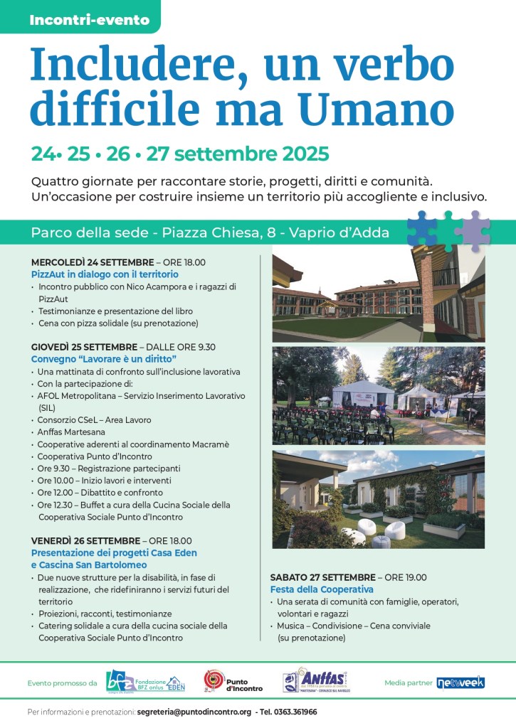 Area Lavoro parteciperà al convegno organizzato dalla cooperativa sociale Punto d’Incontro giovedì 25 settembre a Vaprio d’Adda all’interno della rassegna “Includere, un verbo difficile ma umano”.